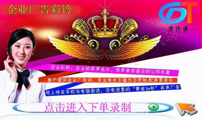 例如:欢迎致电成达通彩铃制作中心.本公司签约数十位电台主播,可为客户制作专属的企业广告彩铃,并可上传至您的手机号码与电信固话.从此告别让你嘟嘟声,彰显企业形象,电话接通中,请稍候!